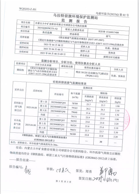 2025年内蒙古大中矿业股份有限公司球团分公司(有组织)