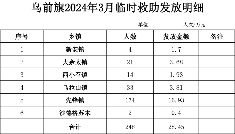 【临时救助】乌拉特前旗2024年3月发放明细