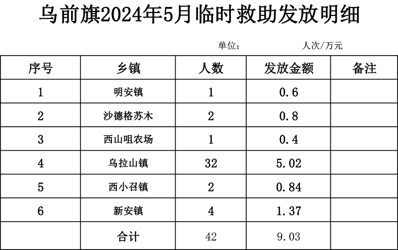 【临时救助】乌拉特前旗2024年5月发放明细
