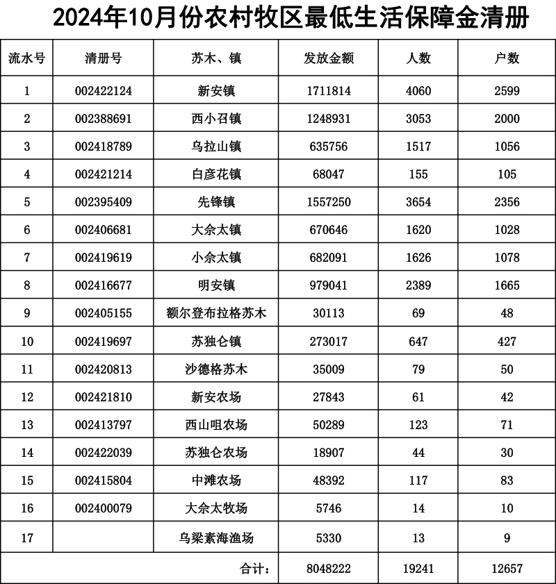 【特困】乌拉特前旗2024年10月发放明细