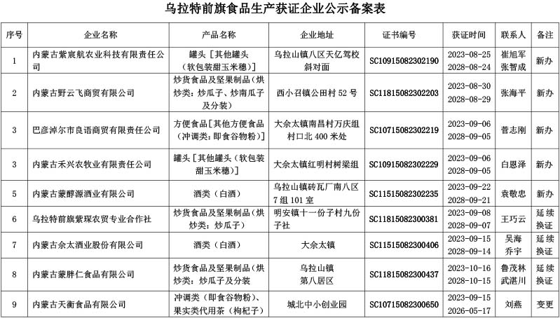乌拉特前旗食品生产获证企业公示备案表