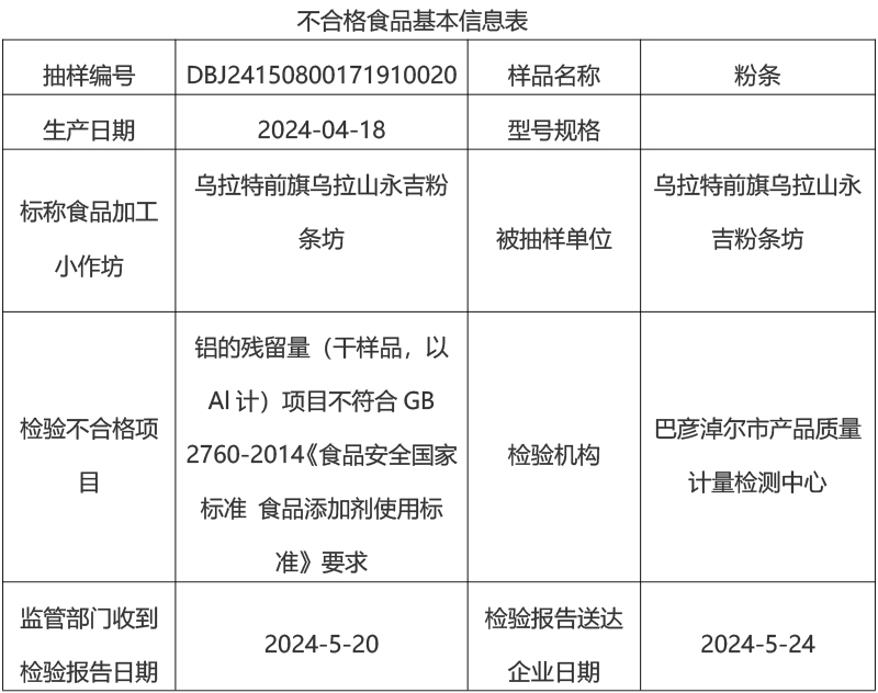 2024年5月20日,我局在国家食品安全抽样检验信息系统收到核查处置检验报告,编号为:S-JS-23-20240010,2024年5月24日将检验报告送达当事人签收,并组织执法人员进行核查,经核实,2024年4月18日巴彦淖尔市市场监督管理局在食品安全监督抽检任务中,对乌拉特前旗乌拉山永吉粉条坊生产加工的粉条进行抽样检验,并委托巴彦淖尔市产品质量计量检测中心进行检验,检验报告显示,生产批次为2024年4月18日的粉条,经抽样检验,铝的残留量(干样品,以Al计)项目不符合GB 2760-2014《食品安全国家标准 食品添加剂使用标准》要求,检验结论为不合格。当事人的行为涉嫌违反了《内蒙古自治区食品小作坊小餐饮店小食杂店和食品摊贩管理条例》第三十三条第(四)项之规定,涉嫌构成生产经营超限量使用食品添加剂的食品的违法行为。为进一步查清事实,我局于2024年6月3日批准立案调查。综上,当事人上述行为违反了《内蒙古自治区食品小作坊小餐饮店小食杂店和食品摊贩管理条例》第三十三条第(四)项规定,依据《内蒙古自治区食品小作坊小餐饮店小食杂店和食品摊贩管理条例》第五十一条第一款规定,经研究决定,依法对当事人作出: 乌前市监处罚〔 2024 〕 61号行政处罚决定