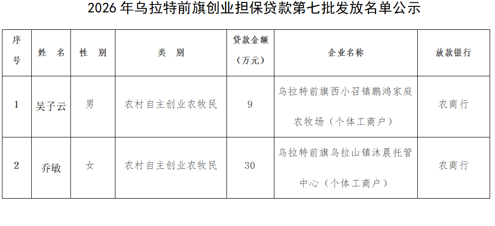 关于乌拉特前旗创业担保贷款第七批发放名单的公示