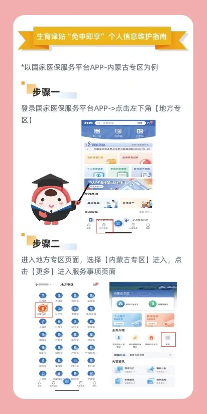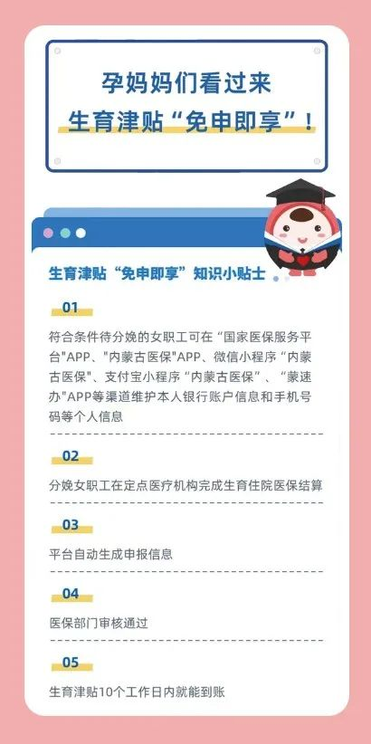 为进一步促进生育津贴发放法治化、标准化、便捷化,方便参保女职工及时享受生育津贴待遇,有效提升参保职工享受医保待遇可及性,乌拉特前旗医疗保障局将实施生育津贴“免申即享”服务作为推动“高效办成一件事”的具体举措,于2024年4月组织定点医疗机构开展系统接口改造、参数配置和系统测试等工作,5月1日起,生育津贴“免申即享”正式上线运行,我旗符合条件的分娩女职工在巴彦淖尔市内范围内生育住院期间,可通过“国家医保服务平台”APP、“内蒙古医保”APP、微信小程序“内蒙古医保”、支付宝小程序“内蒙古医保”、“蒙速办”APP等渠道维护本人银行账户信息和手机号码后由定点医疗机构完成生育住院医疗费用结算后,将相关生育信息通过医保信息平台实时推送至医保经办机构进行审核,对符合领取条件的10个工作日内将生育津贴发放到个人银行账户。