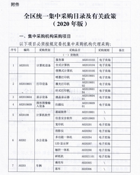 (一)财政部印发《地方预算单位政府集中采购目录及标准指引(2020 年版)》(财库〔2019〕1733号)未进行调整前,《全区统一集中采购目录及有关政策(2020年版)》(内财购〔2019〕1733号),以下简称“原目录”)暂不做调整,有关政策继续执行。