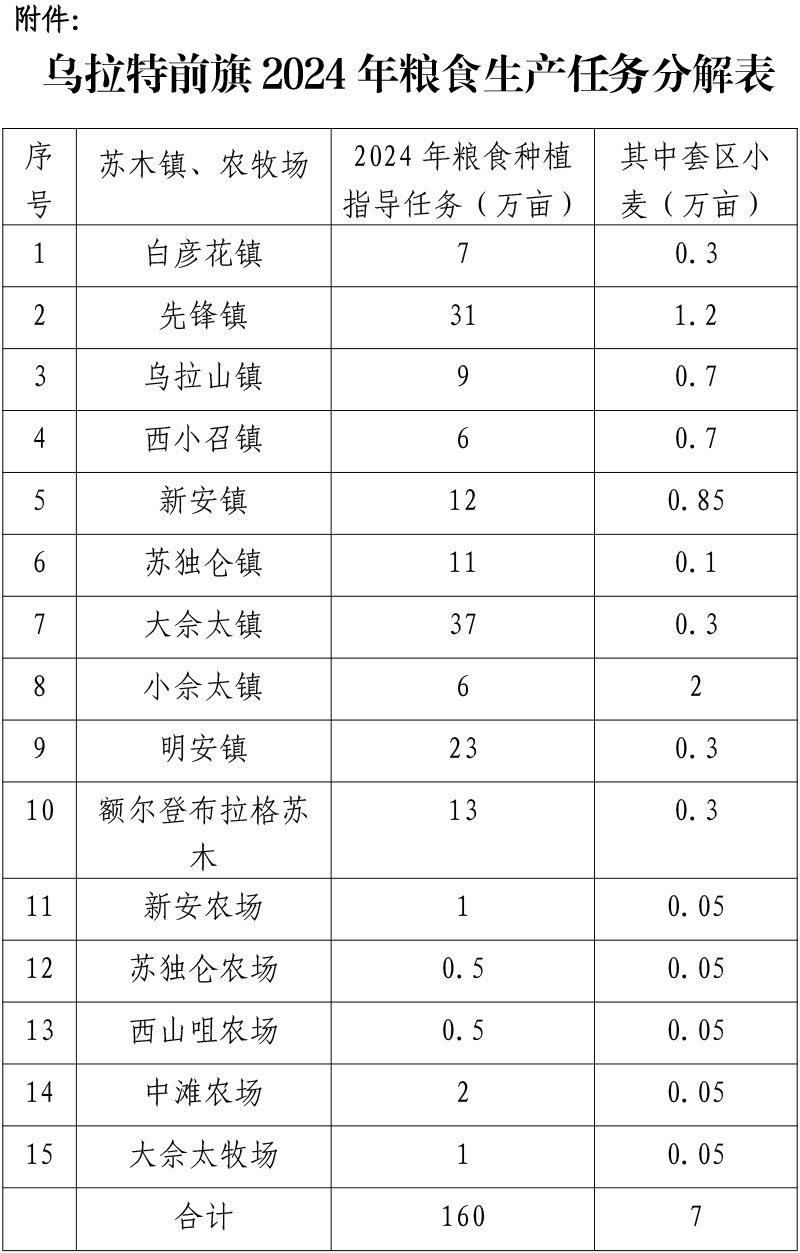 经旗人民政府研究同意,现将《乌拉特前旗2024年小麦及麦后复种补贴标准的实施方案》印发给你们,请认真抓好贯彻落实。