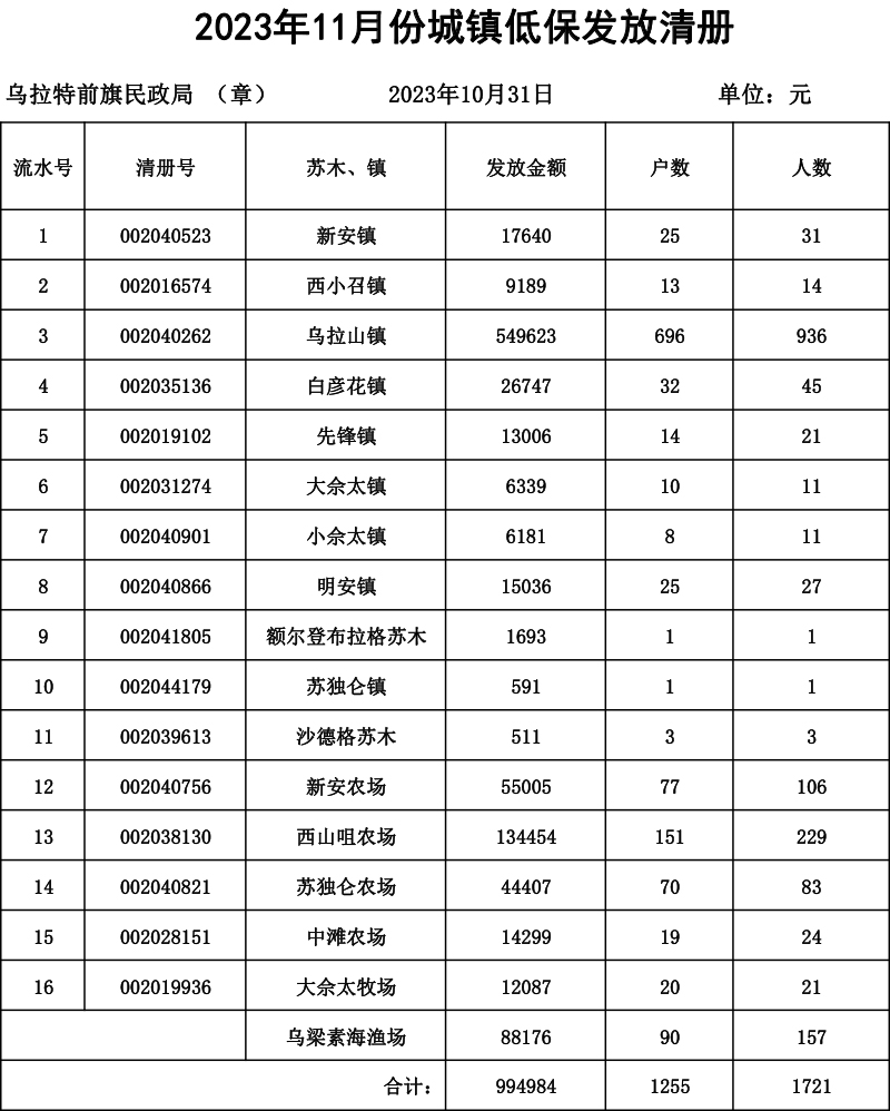2023年11月份城镇低保发放清册