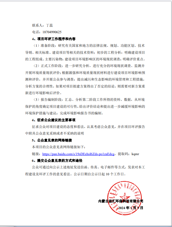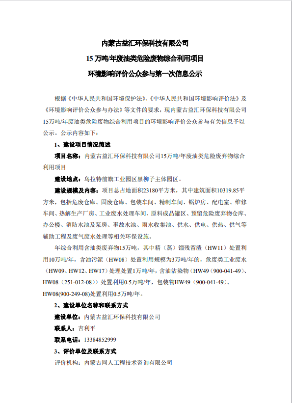 内蒙古益汇环保科技有限公司15万吨/年废油类危险废物综合利用项目环境影响评价公众参与第一次信息公示