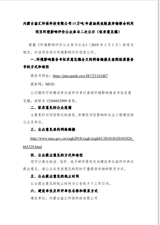 内蒙古益汇环保科技有限公司15万吨/废油类危险废弃物综合利用项目环境影响评价公众参与第二次公示(征求意见稿)