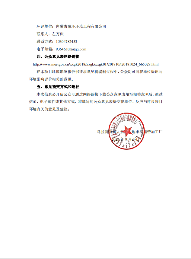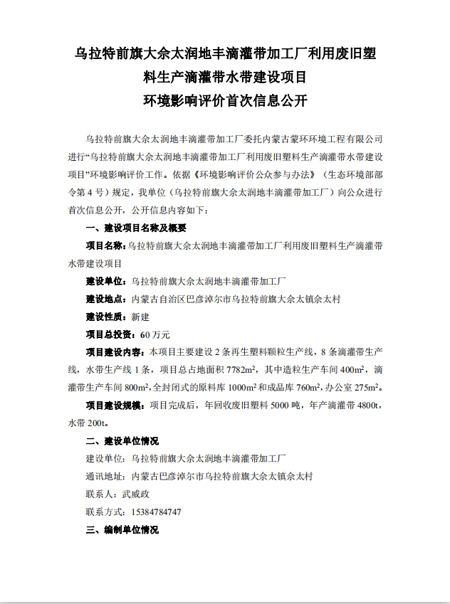 乌拉特前旗大佘太润地丰滴灌带加工厂利用废旧塑料生产滴灌带水带建设项目环境影响评价首次信息公开