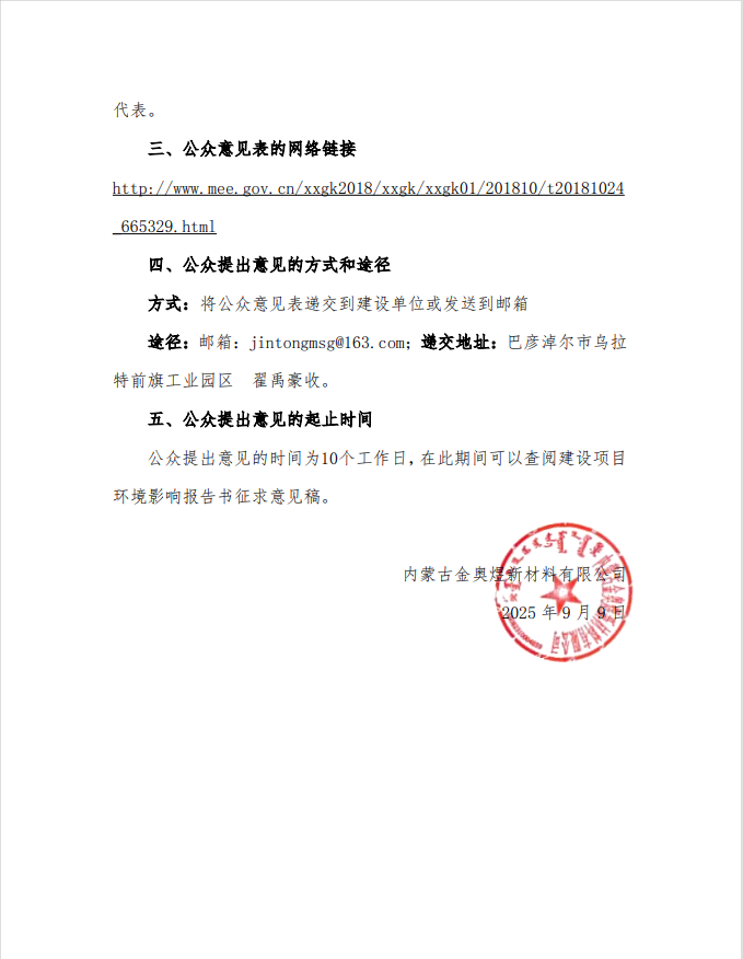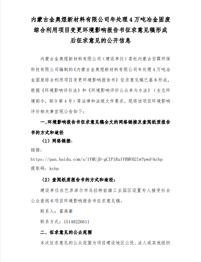 内蒙古金奥煜新材料有限公司年处理4万吨冶金固废综合利用项目变更环境影响报告书征求意见稿形成后征求意见的公开信息
