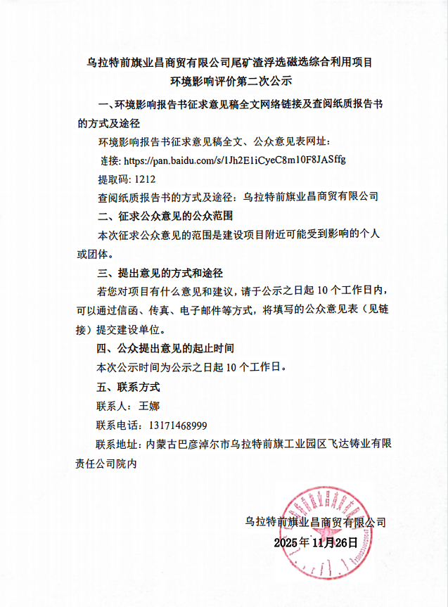 乌拉特前旗业昌商贸有限公司尾矿渣浮选磁选综合利用项目环境影响评价第二次公示