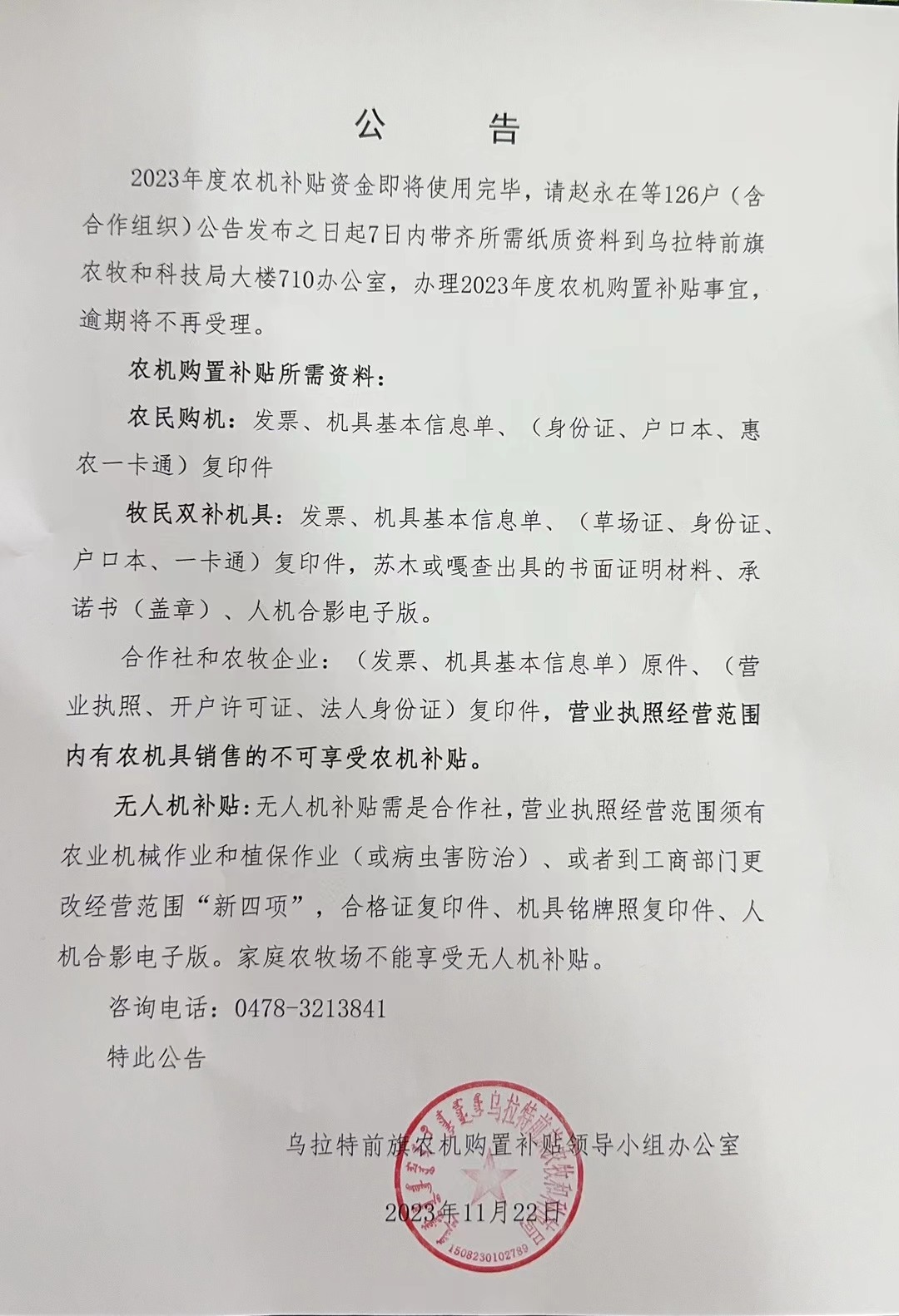 乌拉特前旗2023年11月份高龄津贴发放情况