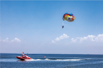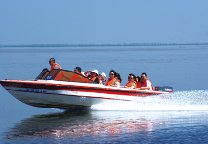 延伸式码头,曲折插入湖区,走在上面,你看水波洋溢,水鸟嬉戏,微风吹拂,看碰碰船碰出喜悦,体验水中竹筏悠闲自在,最令人兴奋的要数水上摩托艇、快艇和海上拖伞,当你行进在宽阔无垠的海上“高速公路”,海水飞溅,倍感刺激,使你忘掉生活中的烦恼,全身心地放松着,去感受大自然的恩赐,海面飞翔的乐趣。