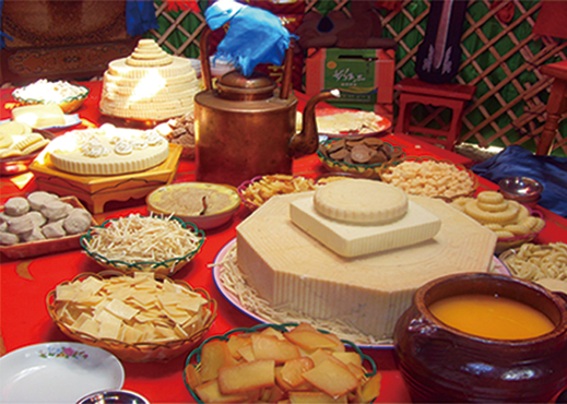 奶食:蒙语叫“查干伊德”是纯洁吉祥的意思。奶食品主要有六种:1、白油。将鲜奶放入桶内,搅拌后,使其发酵等脂肪在上面呈白色,即成白油。2、黄油。将白油用纱布过滤,然后倒入锅中加温火炼,用勺频频搅动,待色泽微黄,即成黄油。3、奶皮子。夏秋季,将鲜奶放在锅中,用小火烘,稍滚,用勺扬,使奶泡沫在上面,同时点上生奶,奶上即成皮一层,用筷子挑起,放在通风处阴干就是奶皮子。4、奶豆腐有两种做法:将出白油后的酸奶子,经慢火熬煮,放入布袋压榨成为酸奶豆腐;另一种是,将奶放入器皿中发酵,将上面一层“卓口”取出后,再放入锅中煮沸将酸奶汤抛出,经多次搅拌后,再倒入木模中,便成各种型块,然后切成长条或小放块,在太阳下吹晒、晾干,即成为奶豆腐。是牧民冬季的奶食品。 5、奶酪通常做法是:将黄油所余下的奶水放到热处,待其发酵、沉淀,把沉淀下的粉块装入布袋压榨,捏成各种形状,晾干后即成奶酪。6、奶果子。以白面和鲜奶糖混起来,做成饼或其他形状,用油炸即成。黄油、白油、奶皮子为牛奶中的精华,具有独特的纯香味,营养丰富,最为贵重,吃用时,再加奶茶、奶果子、炒米,常是招待贵宾的佳品。奶豆腐,奶酪是奶制品中最普通的食品,蒙古族制作奶食品的历史悠久,别具一格。