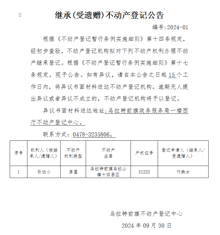 代换女继承(受遗赠)不动产登记公告