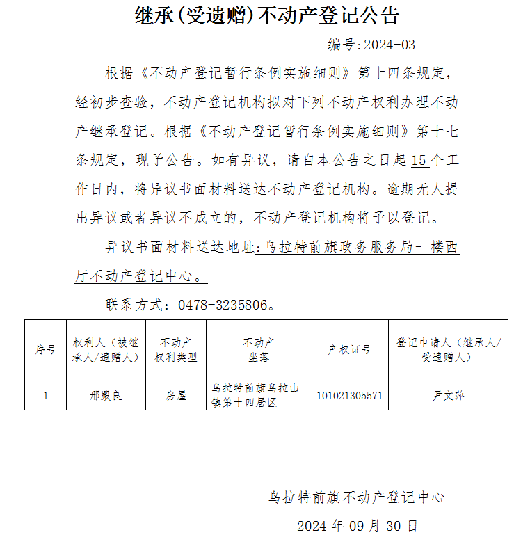 尹文萍继承(受遗赠)不动产登记公告