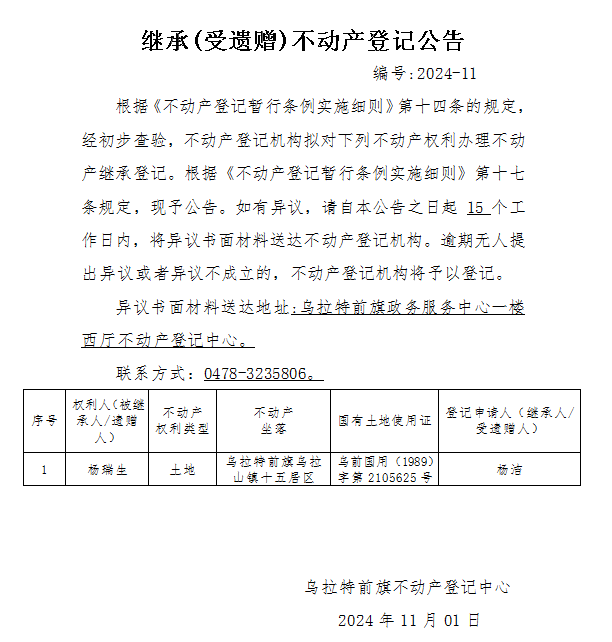 杨洁继承(受遗赠)不动产登记公告
