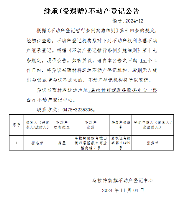 张秀兰继承(受遗赠)不动产登记公告