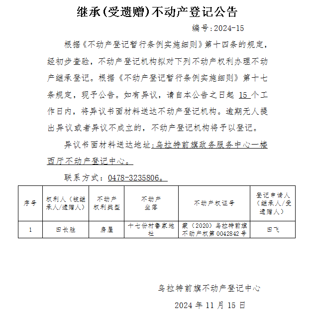 田飞继承(受遗赠)不动产登记公告
