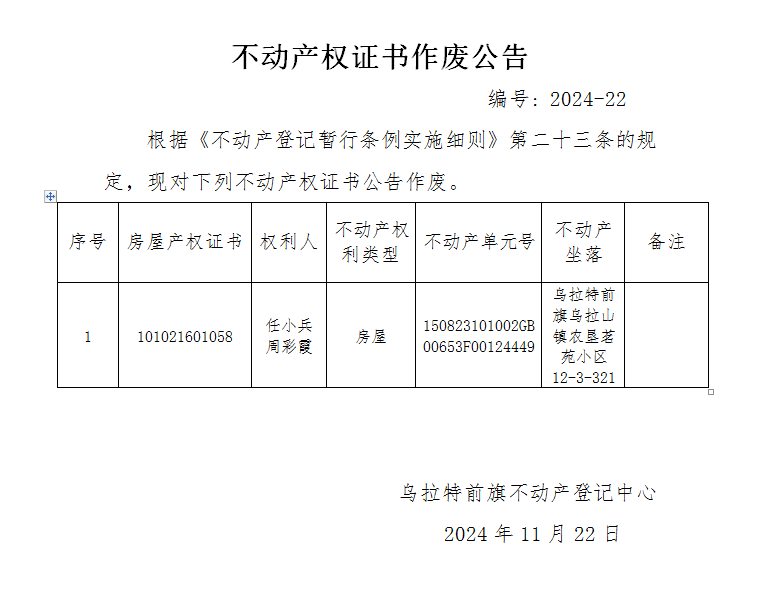 任小兵、周彩霞不动产权证书作废公告