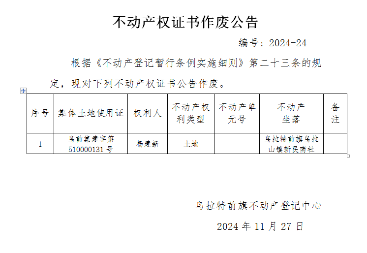 杨建新不动产权证书作废公告