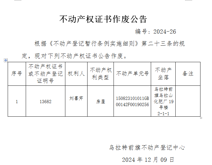 刘喜芹不动产权证书作废公告
