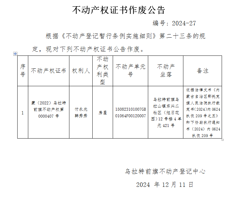 付永光、韩秀秀不动产权证书作废公告