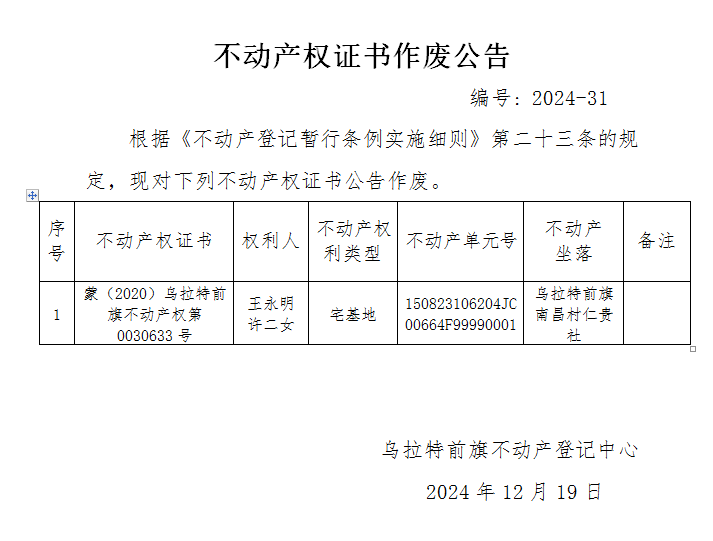 王永明、许二女不动产权证书作废公告