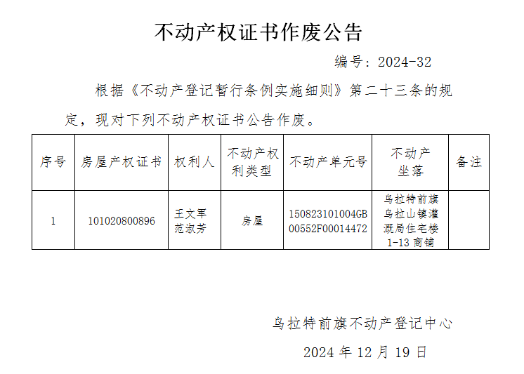王文军、范淑芳不动产权证书作废公告