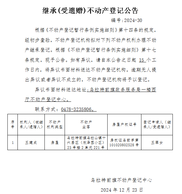 刘凤楼、刘朕继承(受遗赠)不动产登记公告