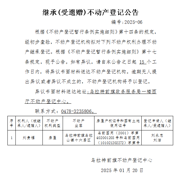 刘永忠、刘洁继承(受遗赠)不动产登记公告