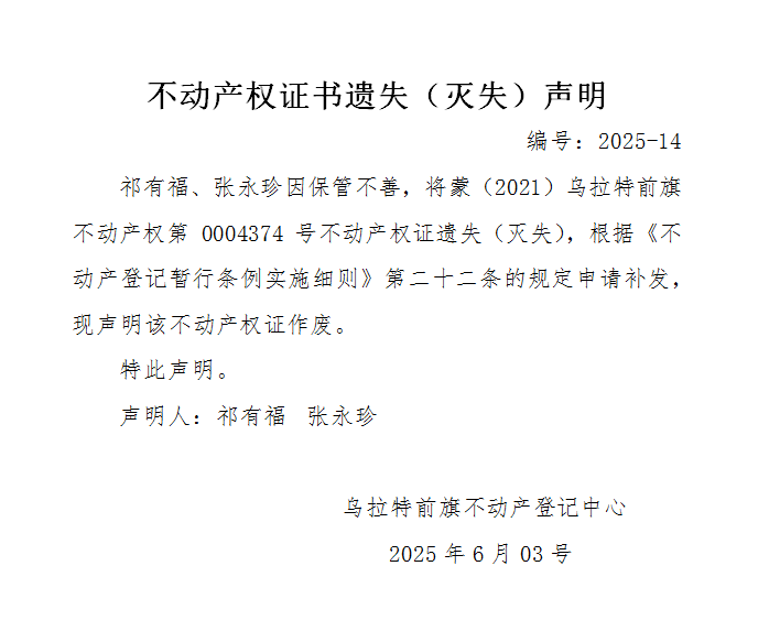 祁有福 张永珍不动产权证书遗失(灭失)声明