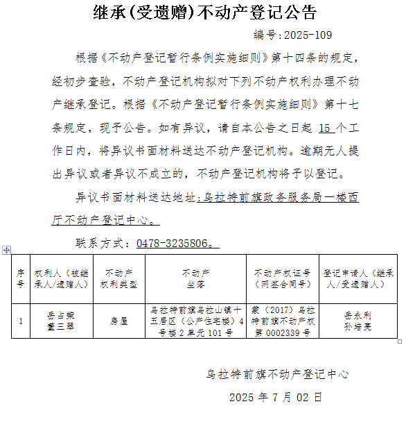 岳永利 孙培亮继承(受遗赠)不动产登记公告