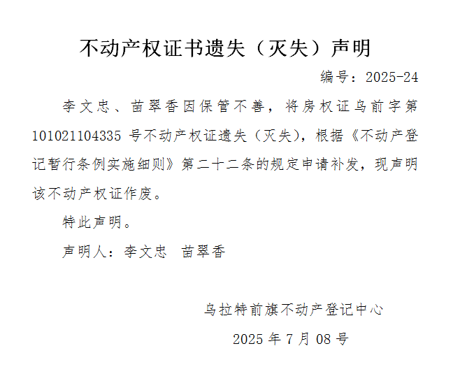 李文忠 苗翠香不动产权证书遗失(灭失)声明