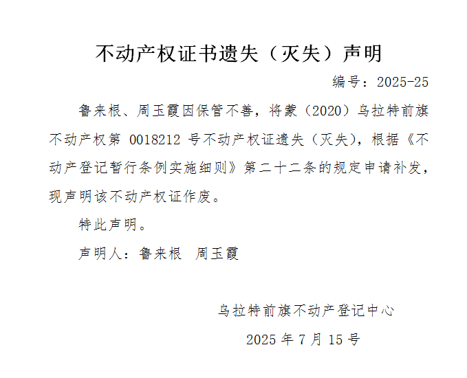 鲁来根 周玉霞不动产权证书遗失(灭失)声明