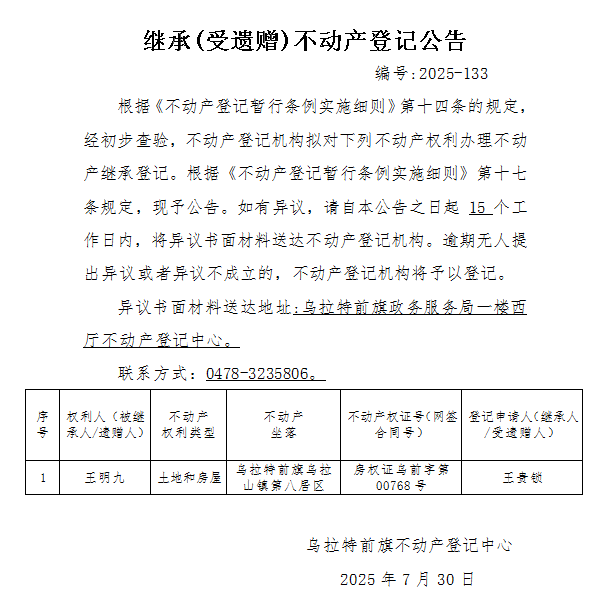王贵锁继承(受遗赠)不动产登记公告