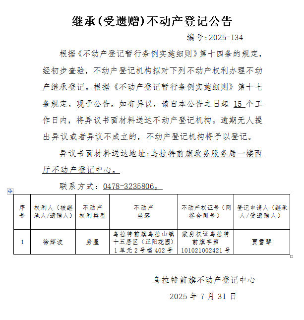 侯踩鸿继承(受遗赠)不动产登记公告