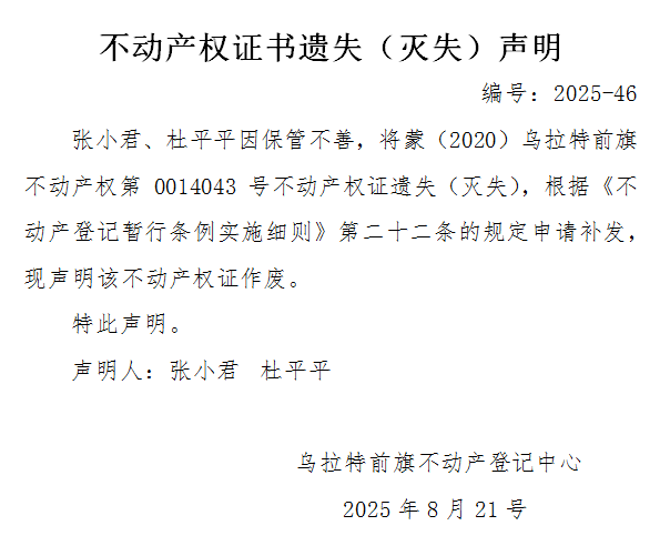 张小君 杜平平不动产权证书遗失(灭失)声明