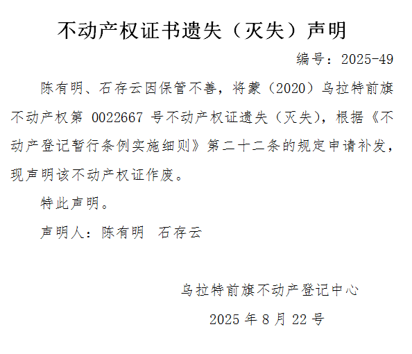 陈有明 石存云不动产权证书遗失(灭失)声明