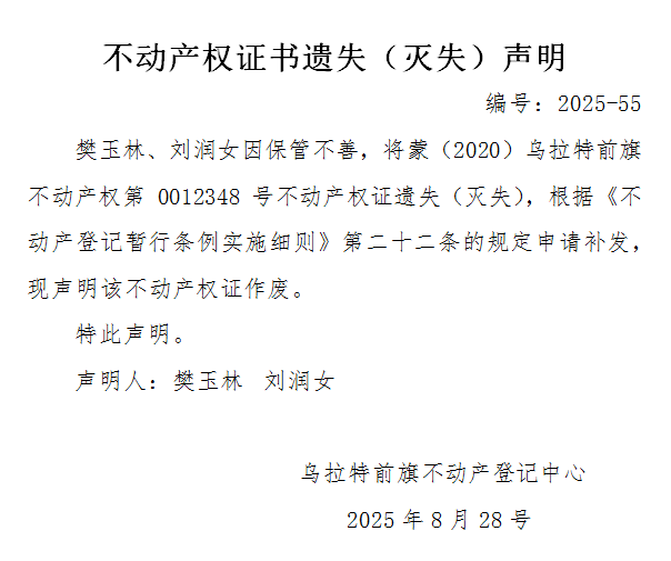 樊玉林 刘润女不动产权证书遗失(灭失)声明
