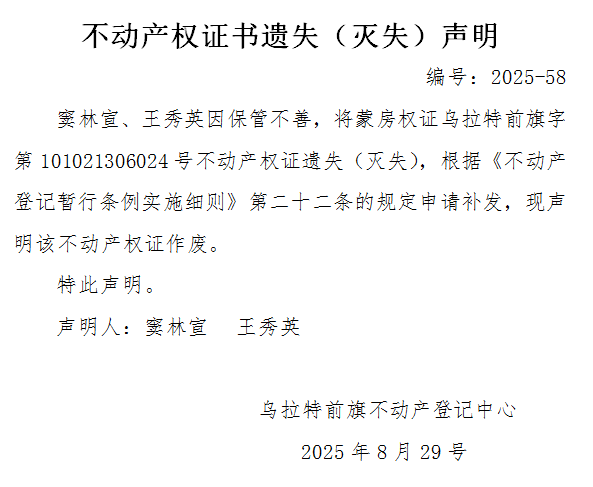 窦林宣 王秀英动产权证书遗失(灭失)声明