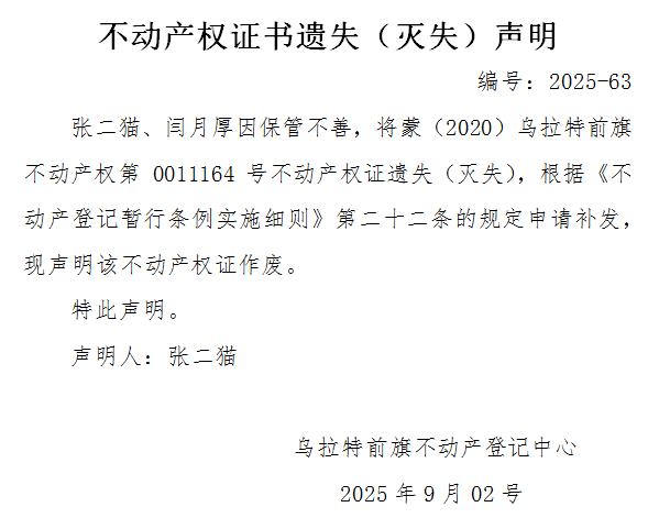 张二猫 闫月厚不动产权证书遗失(灭失)声明