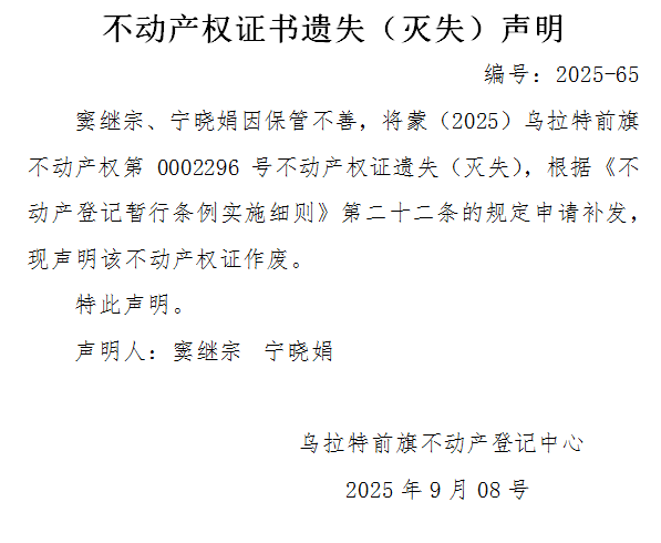 窦继宗 宁晓娟不动产权证书遗失(灭失)声明