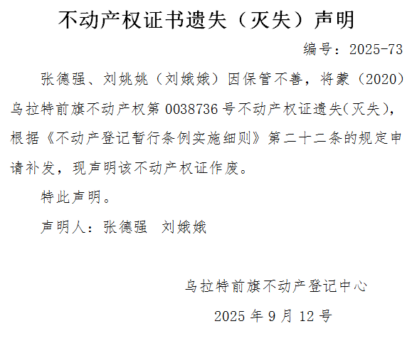 张德强 刘姚姚(刘娥娥)不动产权证书遗失(灭失)声明