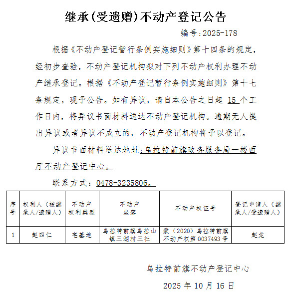 赵龙继承(受遗赠)不动产登记公告