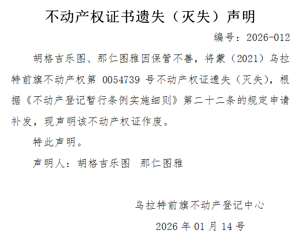 胡格吉乐图、那仁图雅不动产权证书遗失(灭失)声明