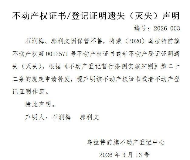 石润梅 郭利文不动产权证书遗失(灭失)声明