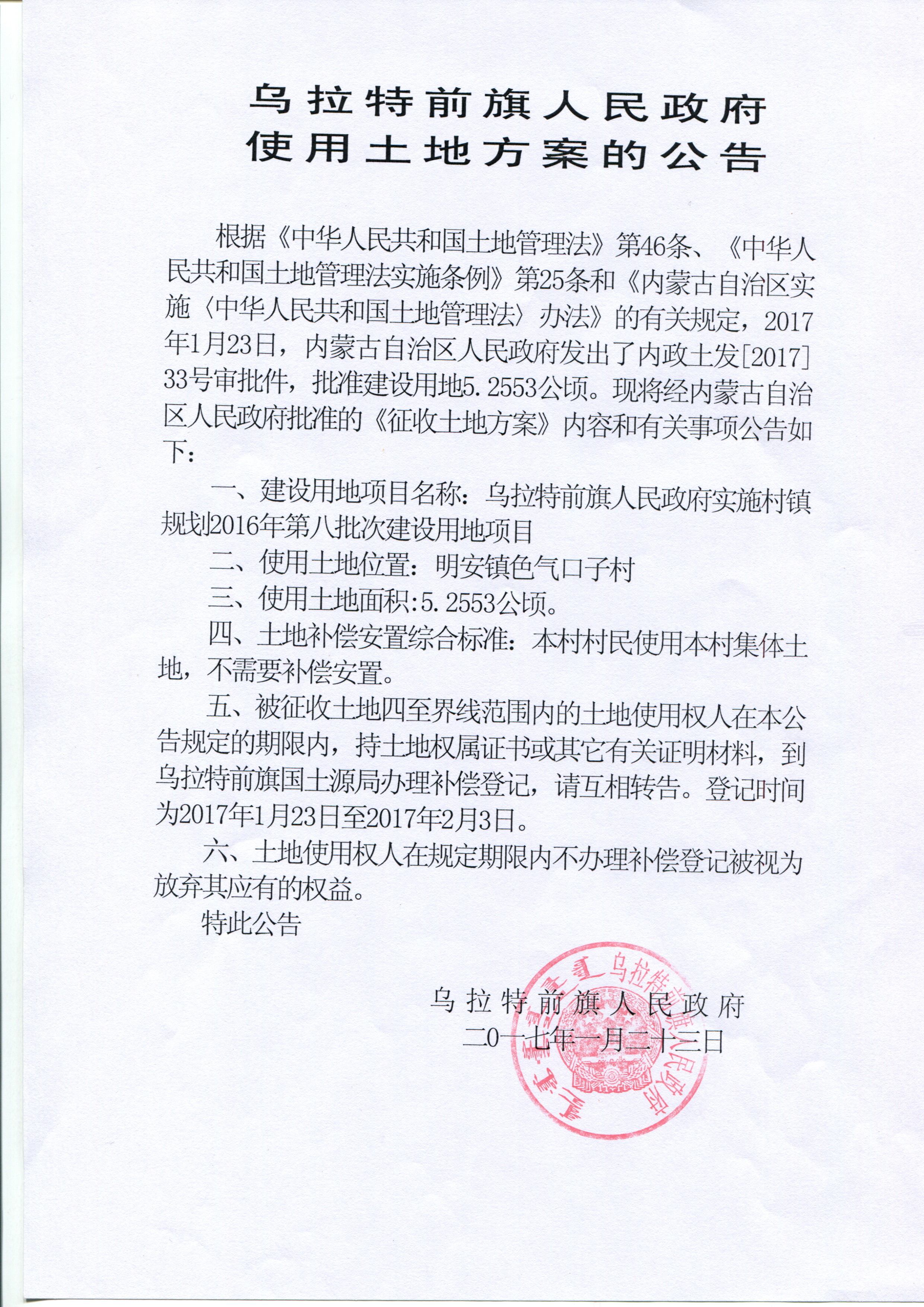 乌拉特前旗人民政府使用土地方案公告-明安镇色气口子村