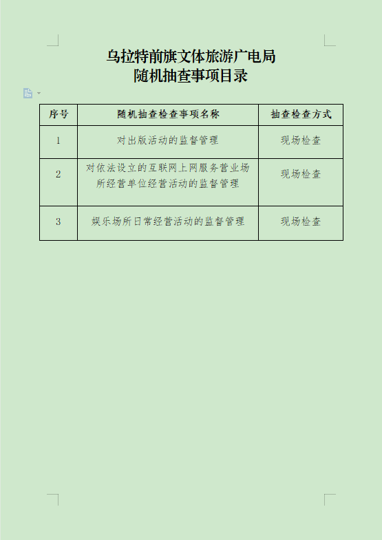 乌拉特前旗文体旅游广电局随机抽查事项目录